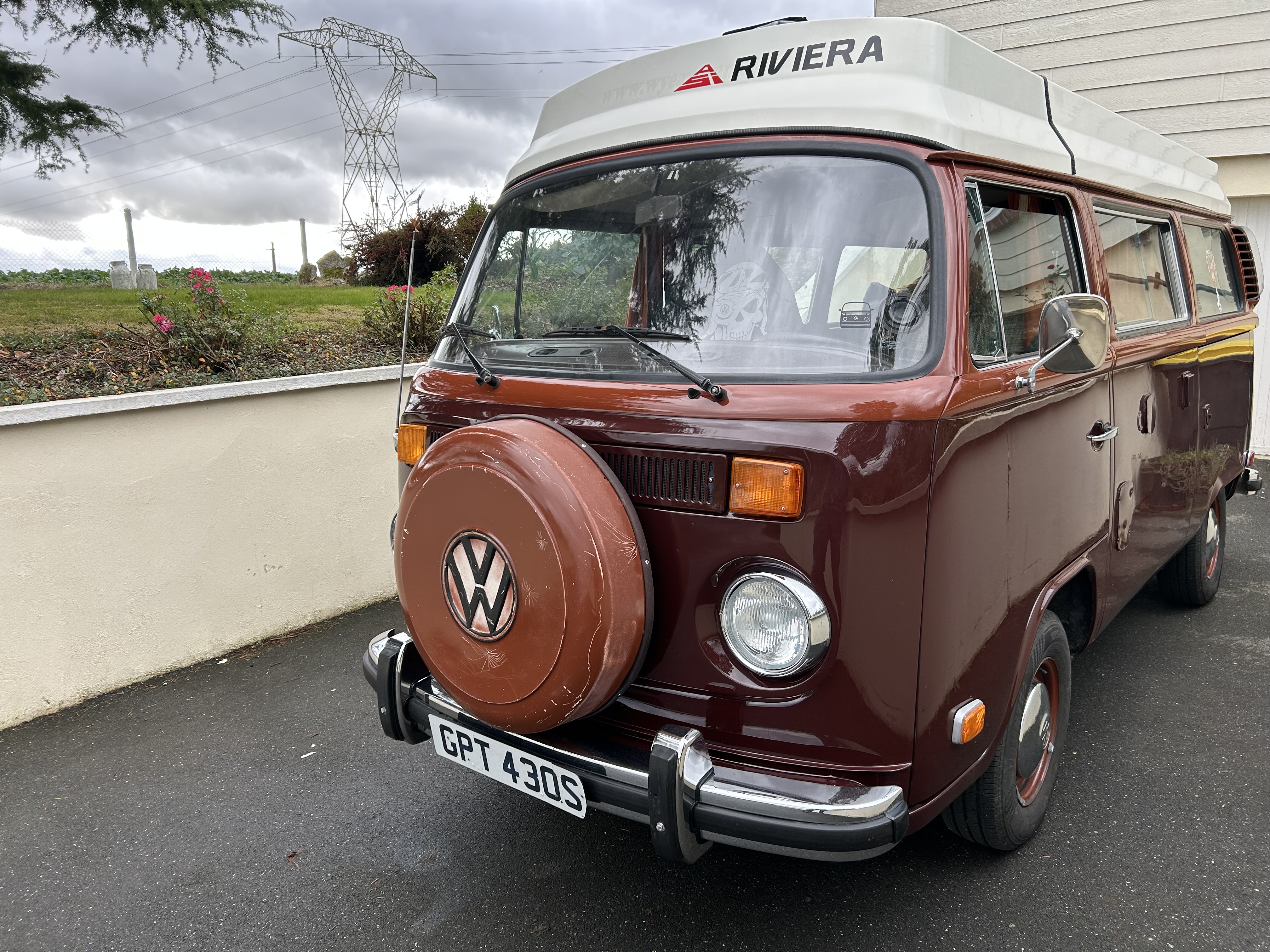 le cache roue vient d’Angleterre Fantomette, je l’avais dénicher un peu par hasard en achetant un projet de restoration Viking RHD c’était en août 2022 c’est au retour d’ailleurs que j’avais échanger avec RVcamper à Cherizet sur ce caché roue atypique .. il était blanc à l’origine et l’ai customiser depuis …