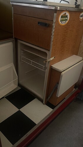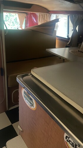 donc optons parfois pour du plus simple. Le frigo a une façade partiellement couverte par le bois de l’aménagement interieur du camper.