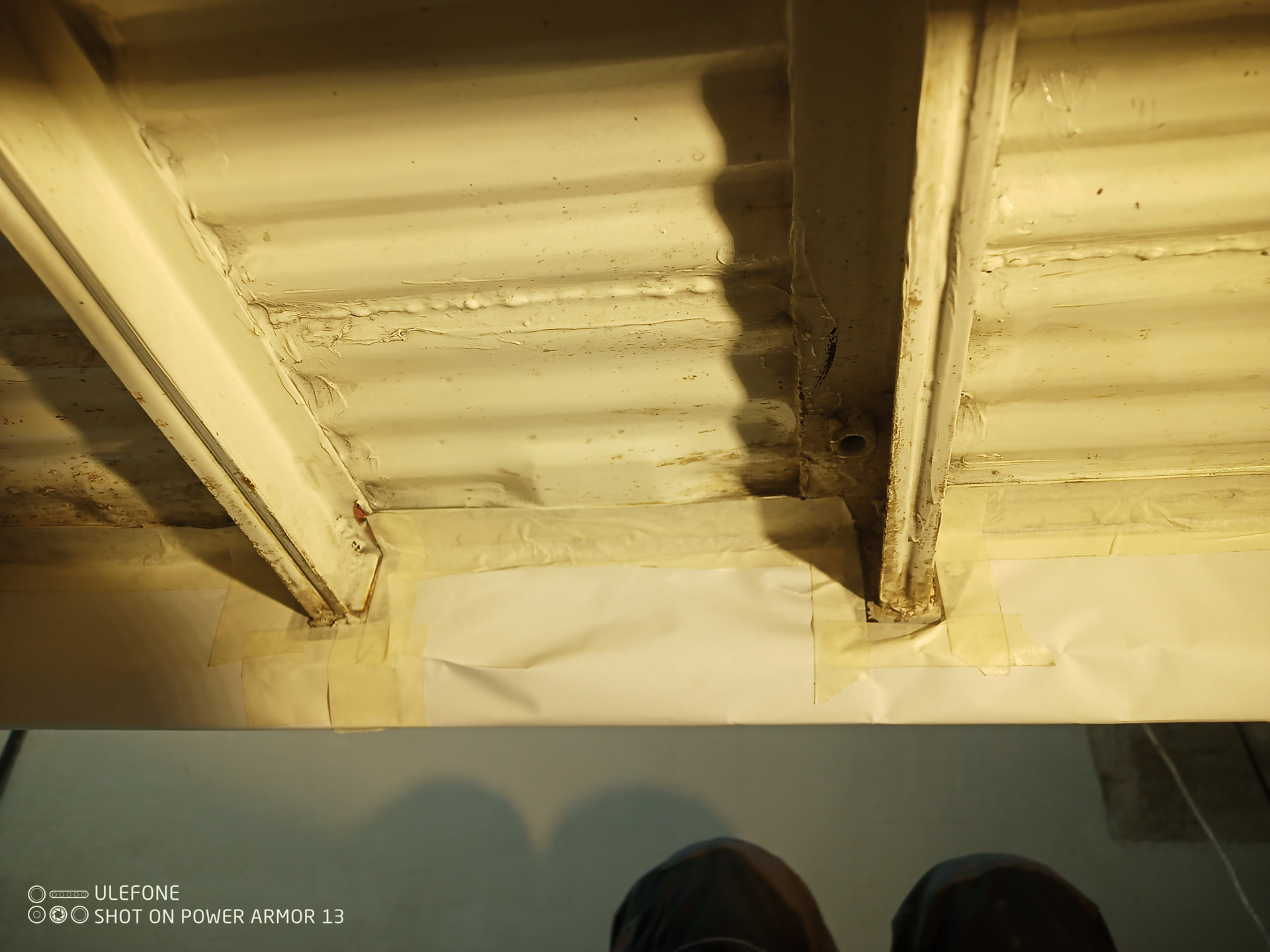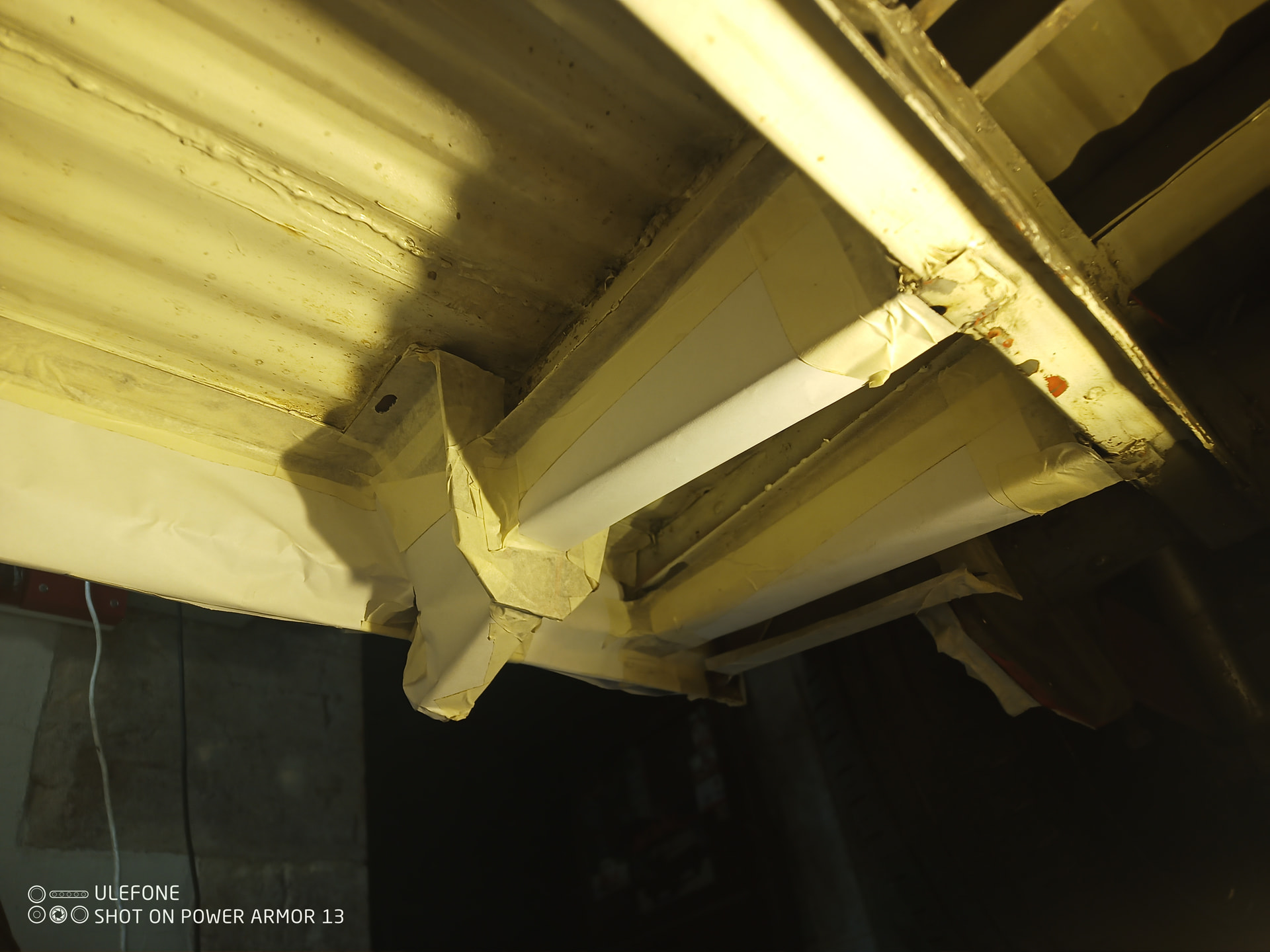 Détail intéressant, même l’interieur de ce renfort en oméga, qui pourtant est inaccessible ( car normalement la traverse est soudé par dessus, je ne l’ai pas encore remise), bin il y a cet appret gris très dure, même sur les points de soudure