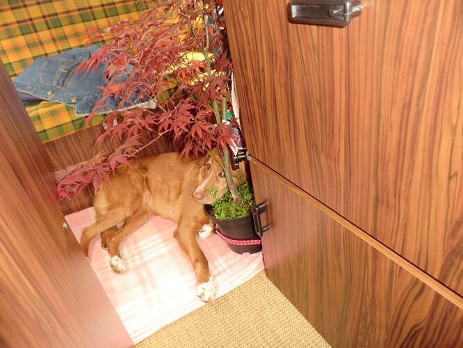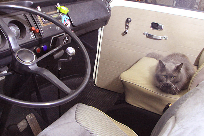 Quand on le laisse dedans, il va dormir sur le lit, derrière la banquette pliée, ou sur les pédales et quand on roule on lui a confectionné un petit siège entre nos sièges pour qu’il puisse contempler la route !! ![]()