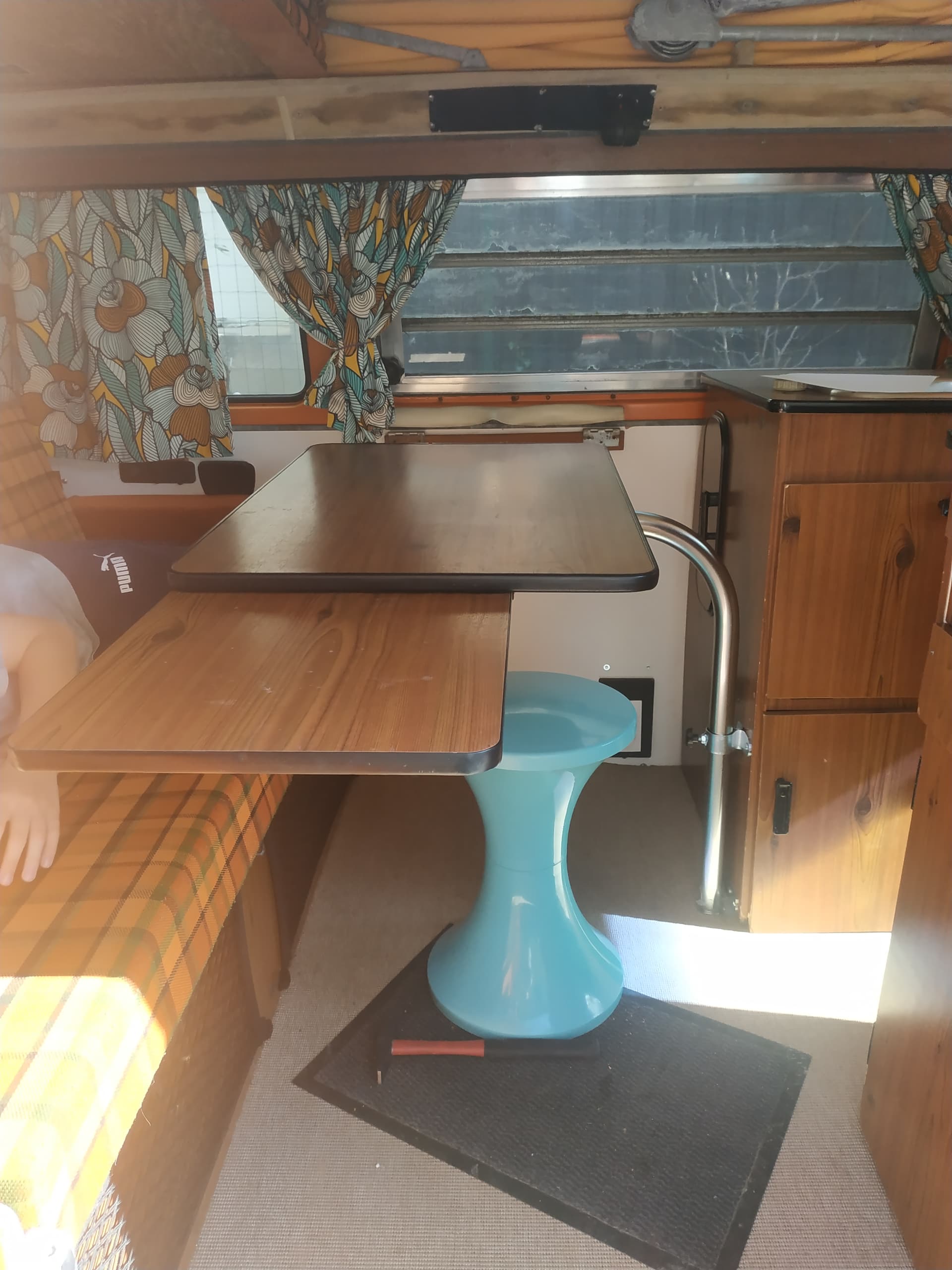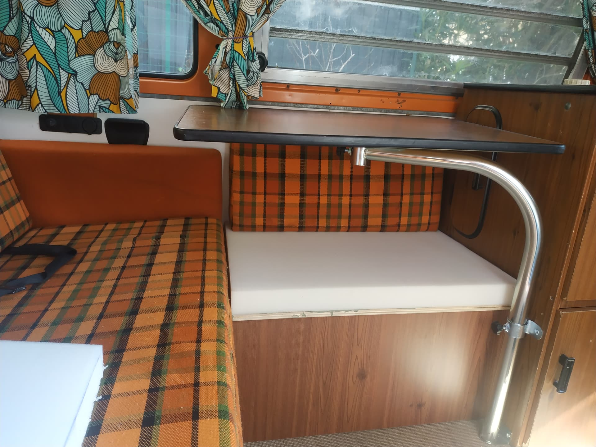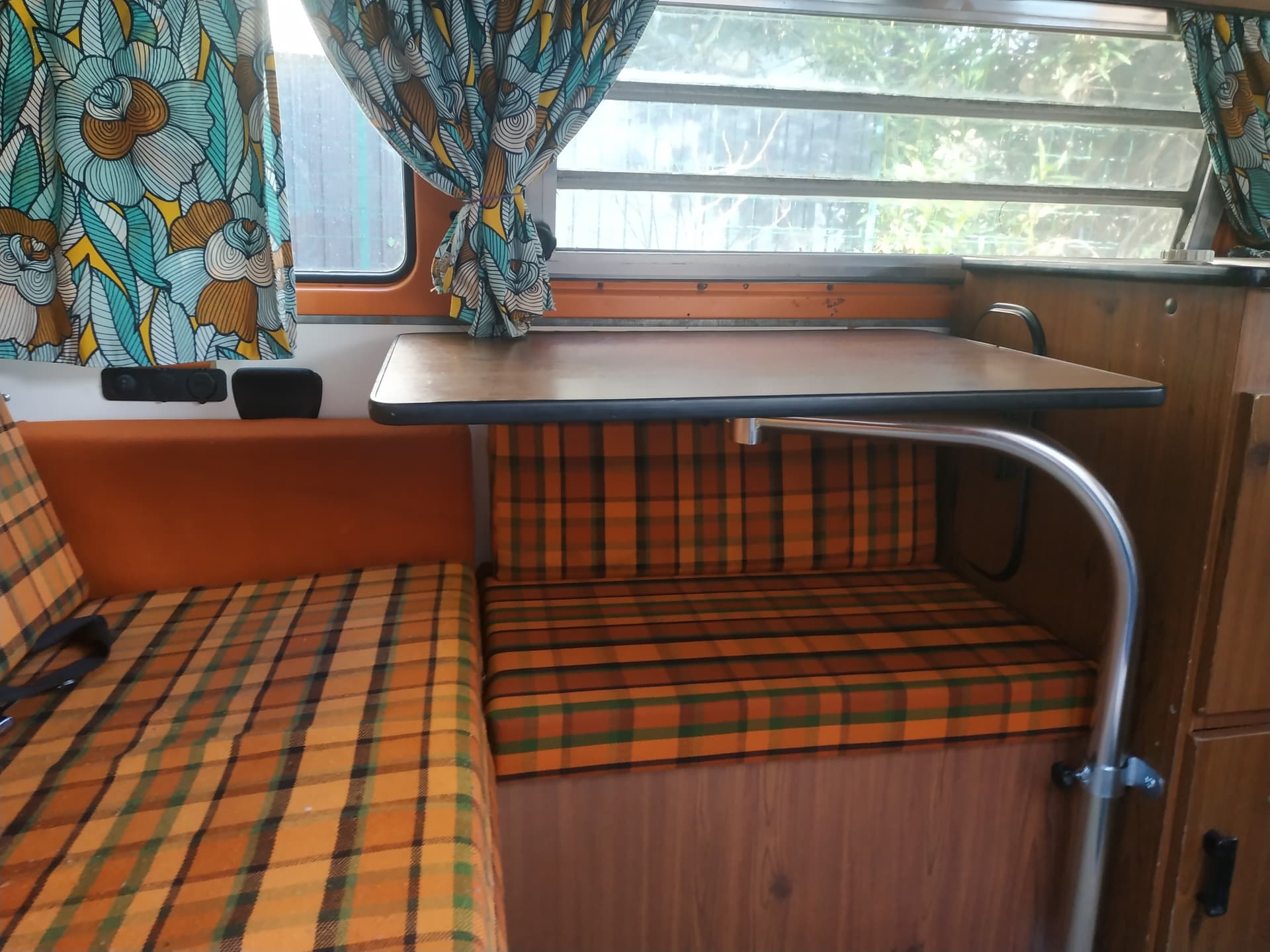 Néanmoins, j’ai moyennement confiance en la solidité des fixations de nos vieux aménagements. J’aurais peur que la table ne vole dans la nuque du conducteur ou de sa passagère en cas de gros coup de frein