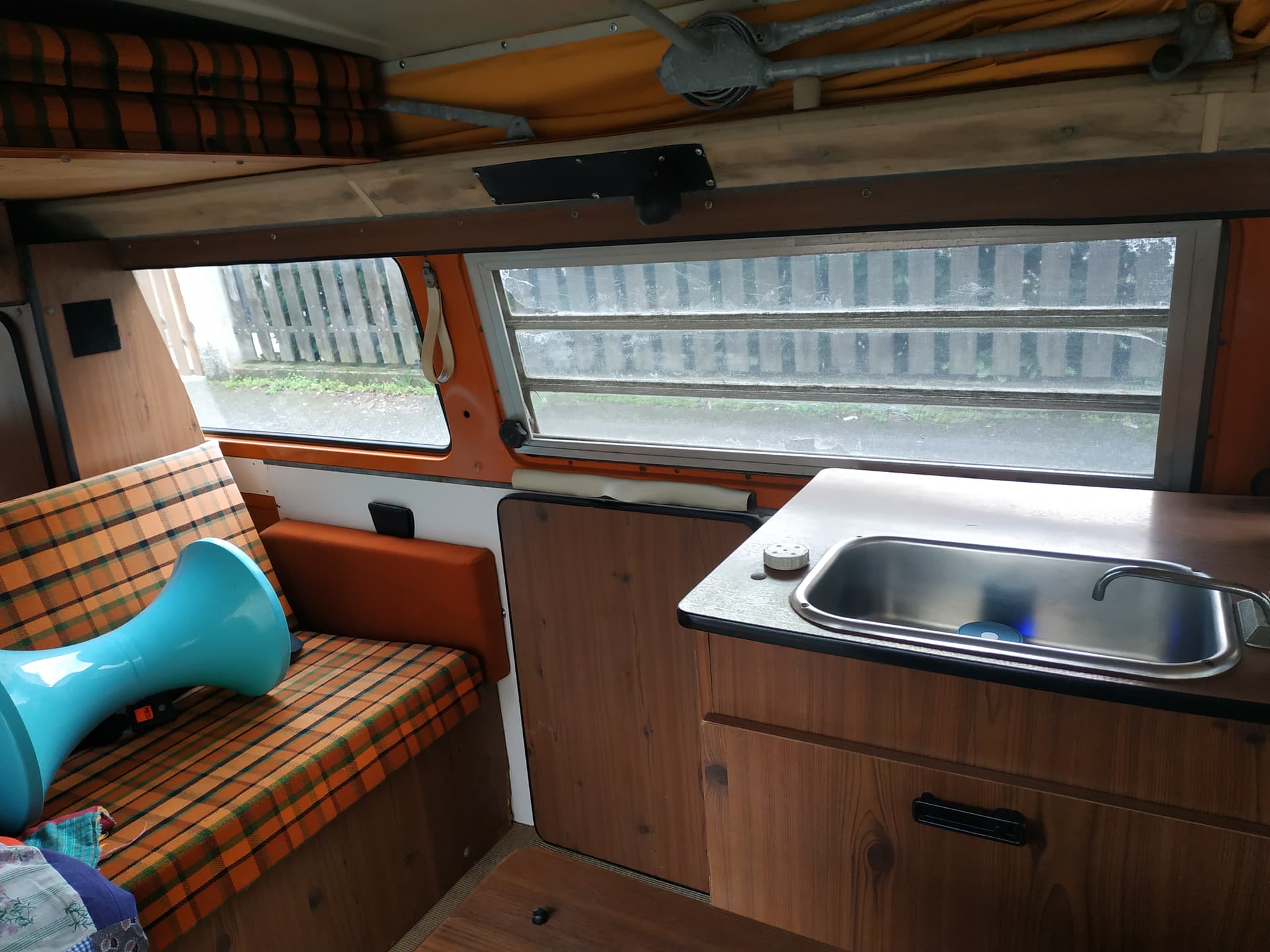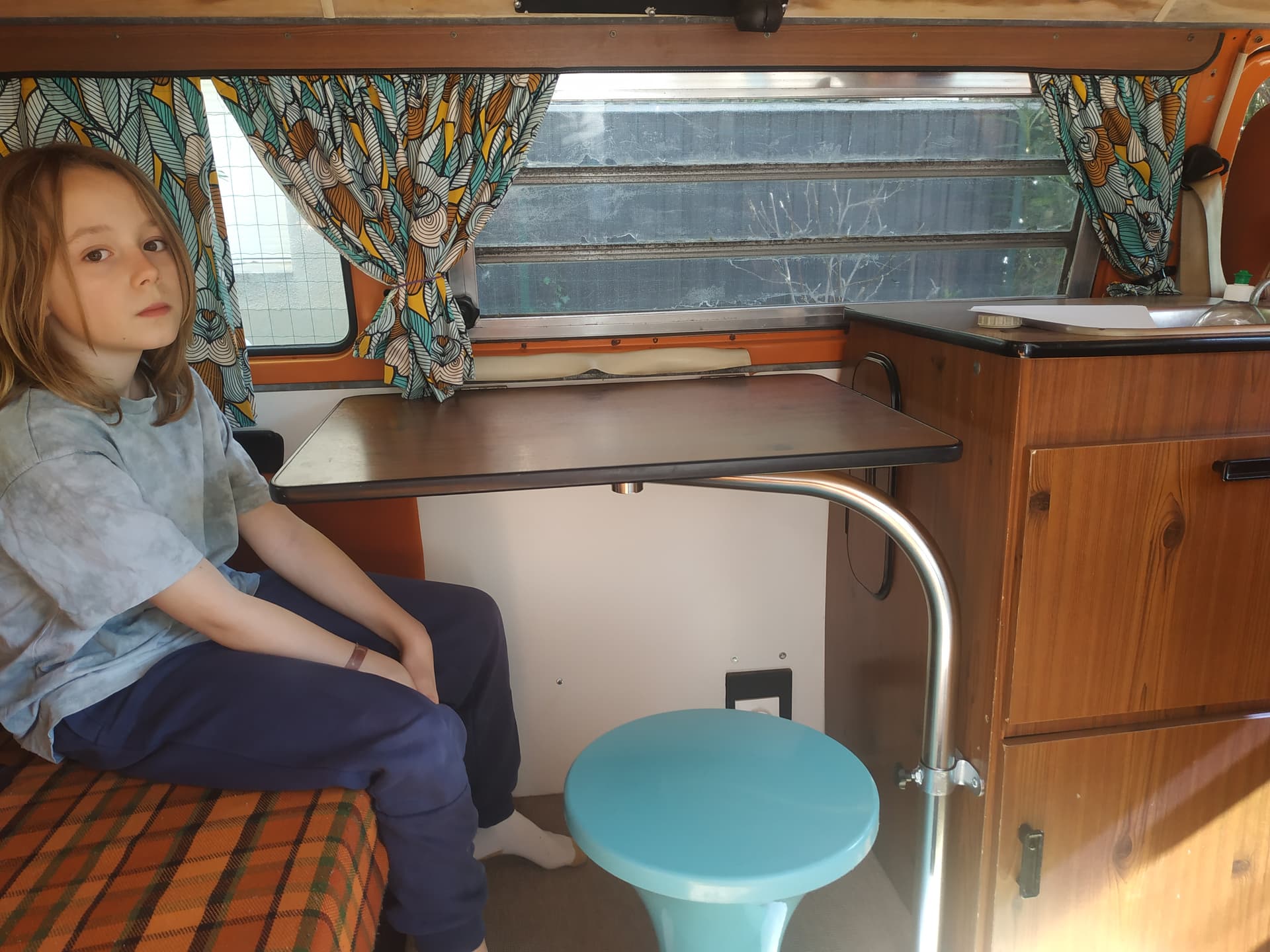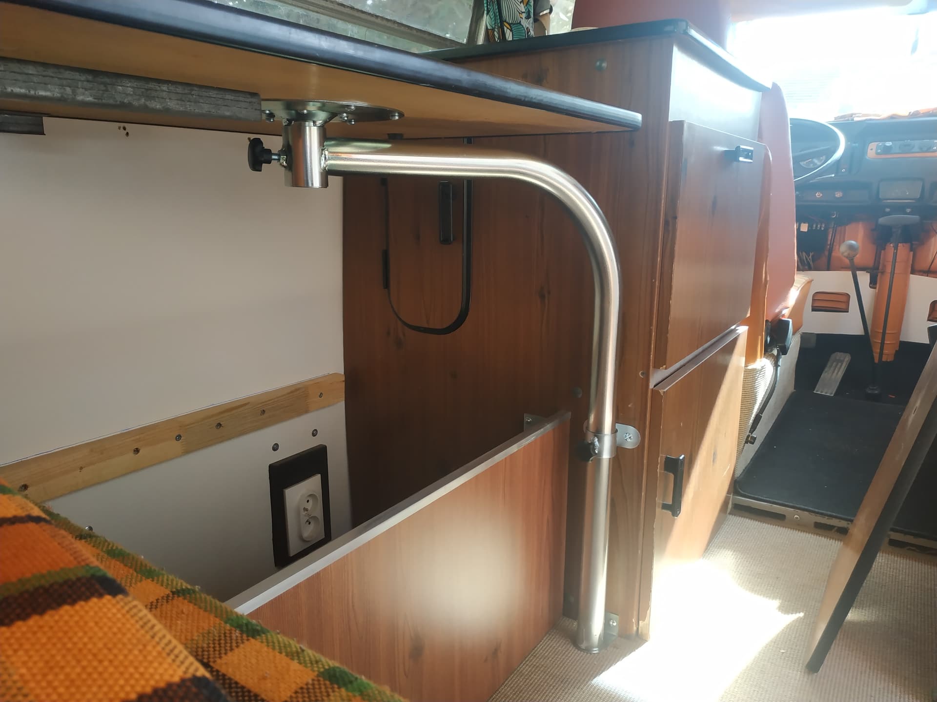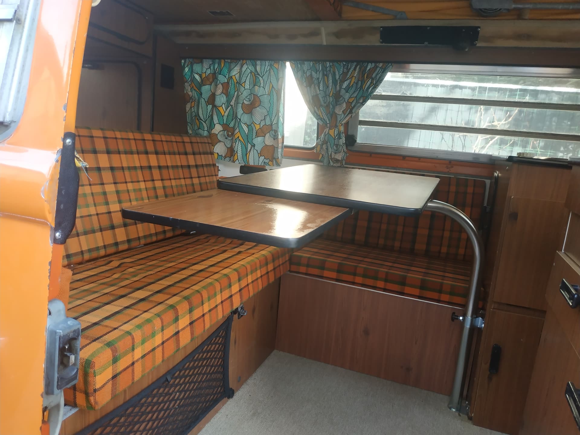 Néanmoins, j’ai moyennement confiance en la solidité des fixations de nos vieux aménagements. J’aurais peur que la table ne vole dans la nuque du conducteur ou de sa passagère en cas de gros coup de frein