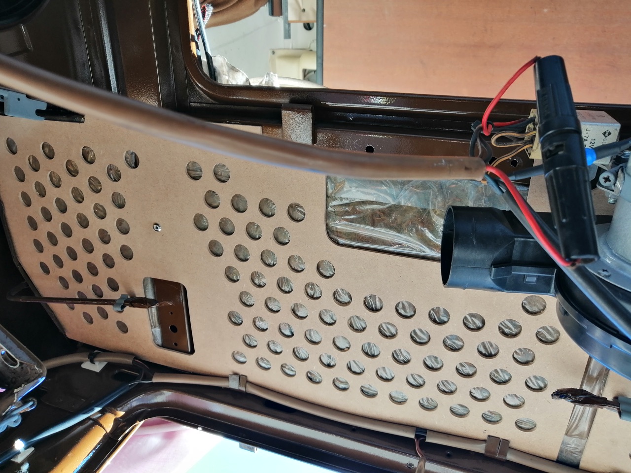 Dans le mien j’ai collé un isolant pour capot de moteur, c’est une mousse insonorisante et anti feu.J’ai collé ça sur la grille de ta photo, du coup le haut de mon compartiment moteur est douillet et brillant façon chrome. C’est charmant.