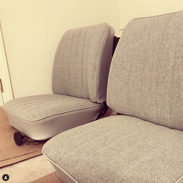 Pour avoir l’expérience des sièges d’origine dans Combivert, je voulais pas partir sur une assise vinyle. L’hiver tu cailles, l’été tu colles, donc non. Mais au début, on pensait faire tout gris, avec le pourtour en vinyl et l’assise en tweed gris, histoire que ça rappelle l’origine. En fait à l’origine, ils étaient plutôt beige d’ailleurs, mais ce qu’on avait entre les mains c’était gris et noir… entre l’age et l’incendie !