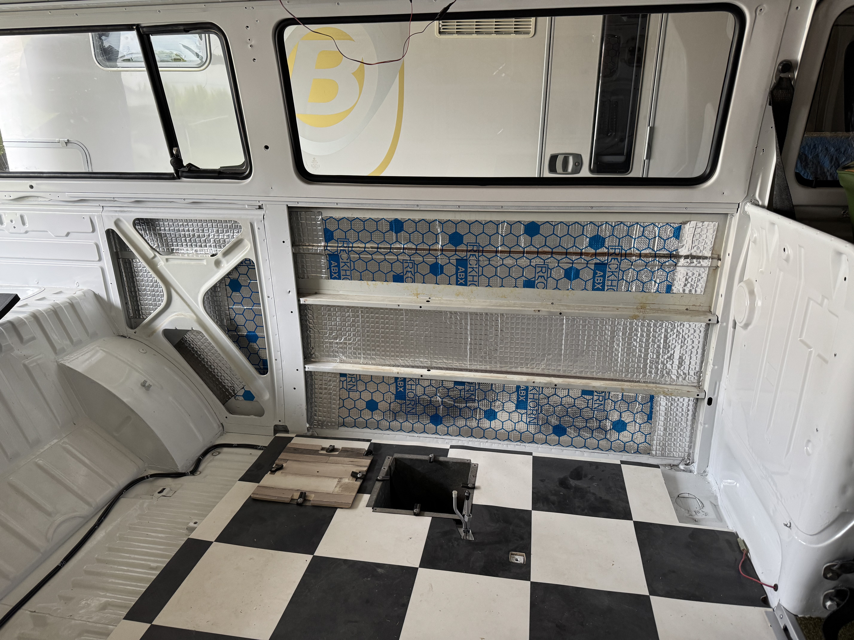 Je me suis redonné du travail pendant que mes jantes sèchent… le week end dernier ont à déjà pas chaumé, remise en peinture des pare-chocs y compris de leurs supports (ferrures pour l’arrière), décapage et peinture du tableau de bord, pose des dernières vitres manquantes, remise à neuf complet du système d’ouverture de la porte latérale (les bagues téflons et butées étaient fatiguées) etc..