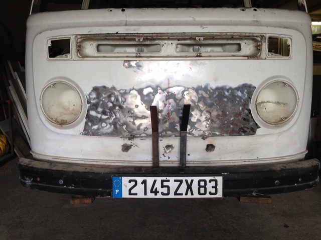 sur les photos la barre noire est définitive, la rouillée me sert de gabarit car trop fine à mon gout, je suis parti sur du 30mm de large, et 4mm d’épaisseur, ça devrait limiter les vibrations et j’espère éviter la déformation de la face avant. je vais renforcer derrière sur la partie basse à l’intérieur de la cabine, en haut je ne pourrai pas, mais je pense que c’est intéressant de la mettre dehors pour le look et la place que ça libère.