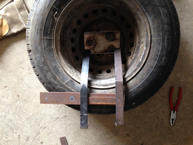 à la place je me suis lancé dans la fabrication du support de roue de secours sur la face avant en essayant de tenir compte des différentes remarques, je suis parti sur une idée proche du modèle d’origine westfalia, j’ai fabriqué des gabarits et commencé à fabriquer les pièces jusqu’à tomber en manque de ferraille, donc jeudi je continuerai à découper