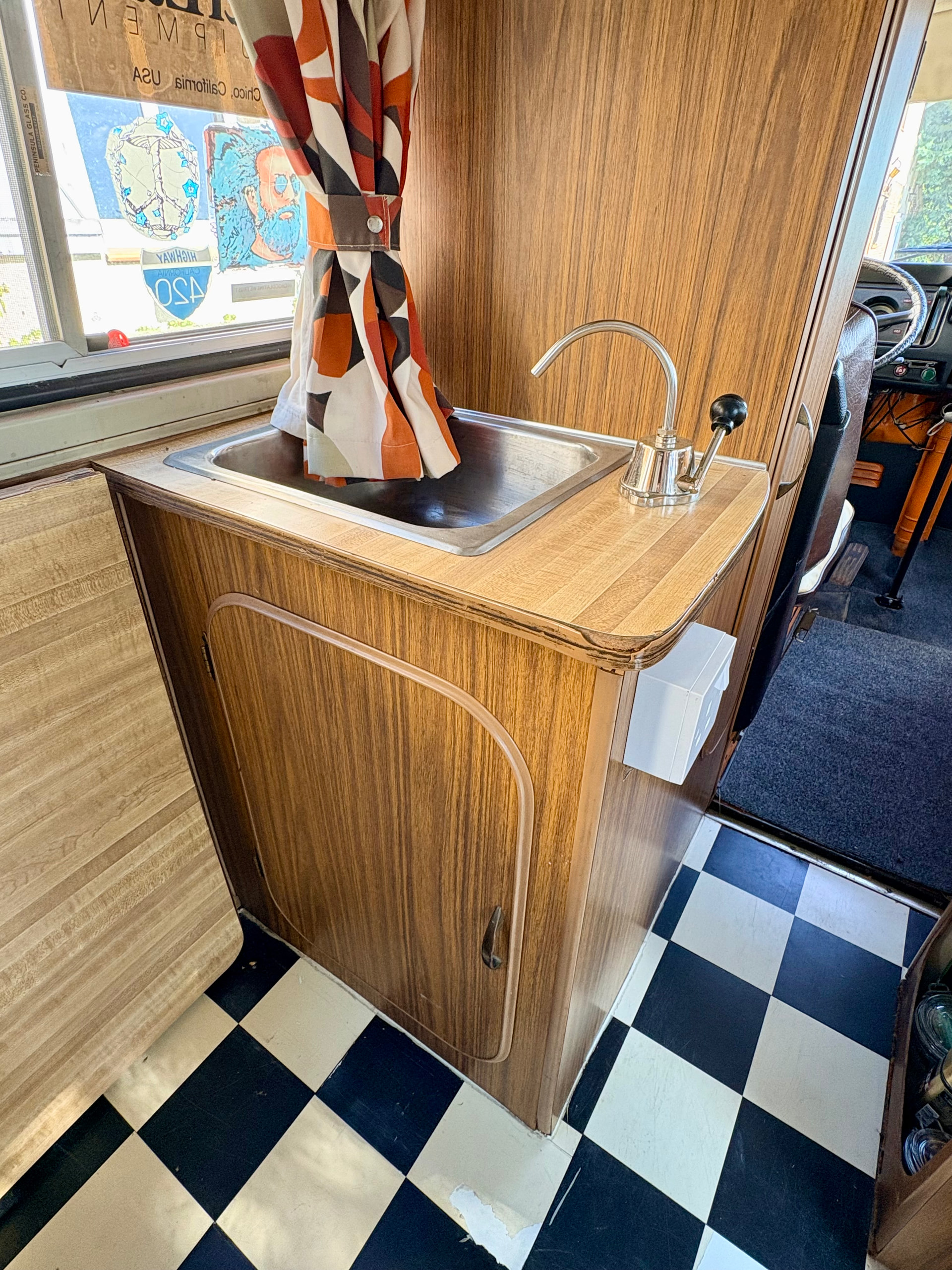Le nôtre est encastré au ras du bois. De temps en temps on voit passer un frigo Norcold sur TheSamba. Un miroir au dessus de l’évier agrandit bien la pièce. On a un porte essuie-tout au dessus mais tu as vu cela déjà.