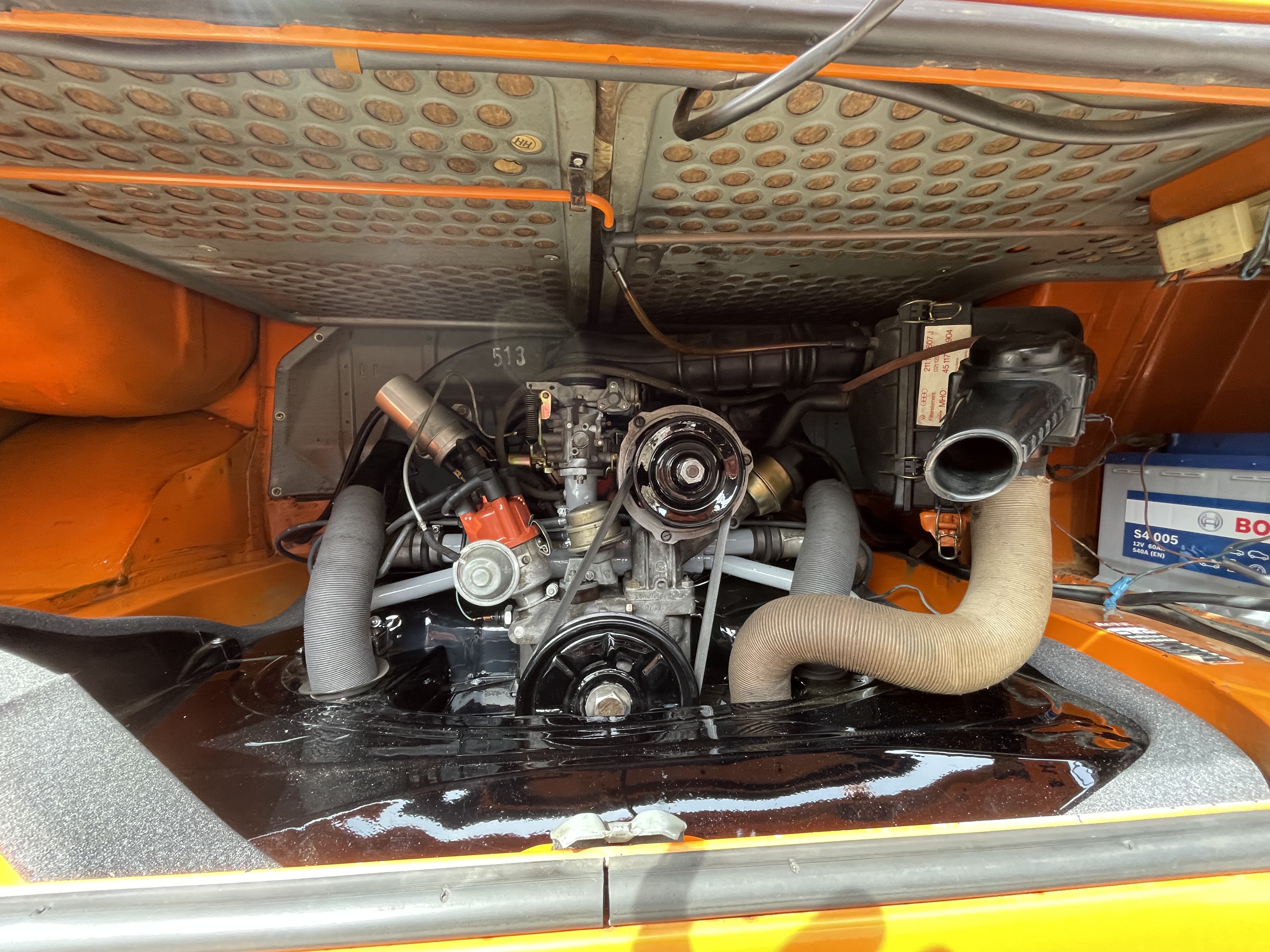 Verdict, tout va bien mais on en profite pour faire l’embrayage qui était d’origine,fils ,échappement ,bobine,bougies,nettoyage carbu et pipe ,vidange de boîte,et peinture des tôles mais pas toutes car sur la coiffe un numéro est présent 513? Je laisse ça dans son état d’origine