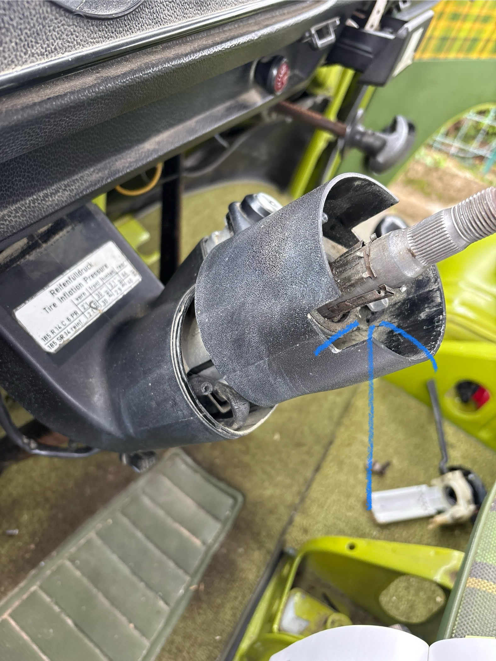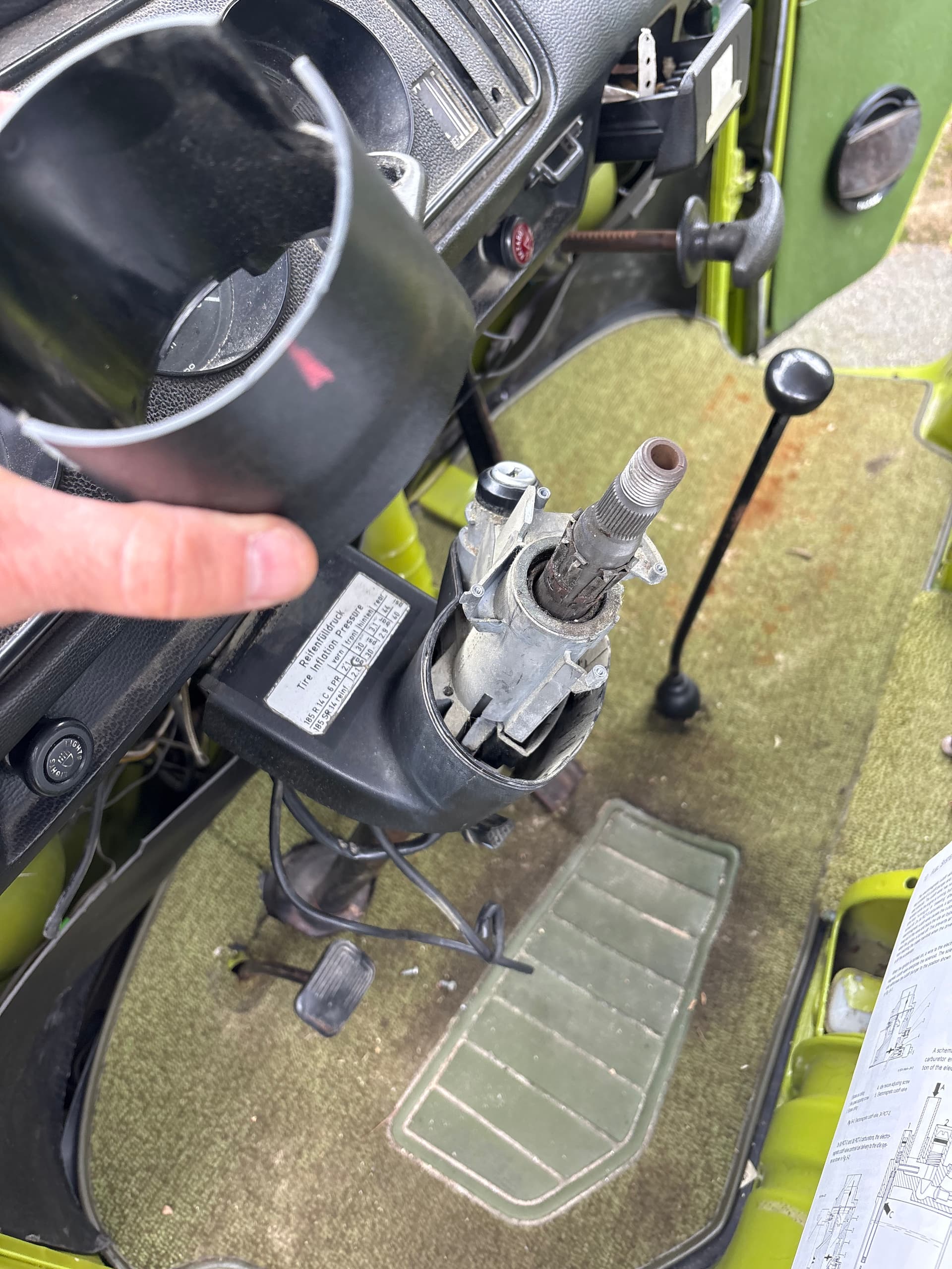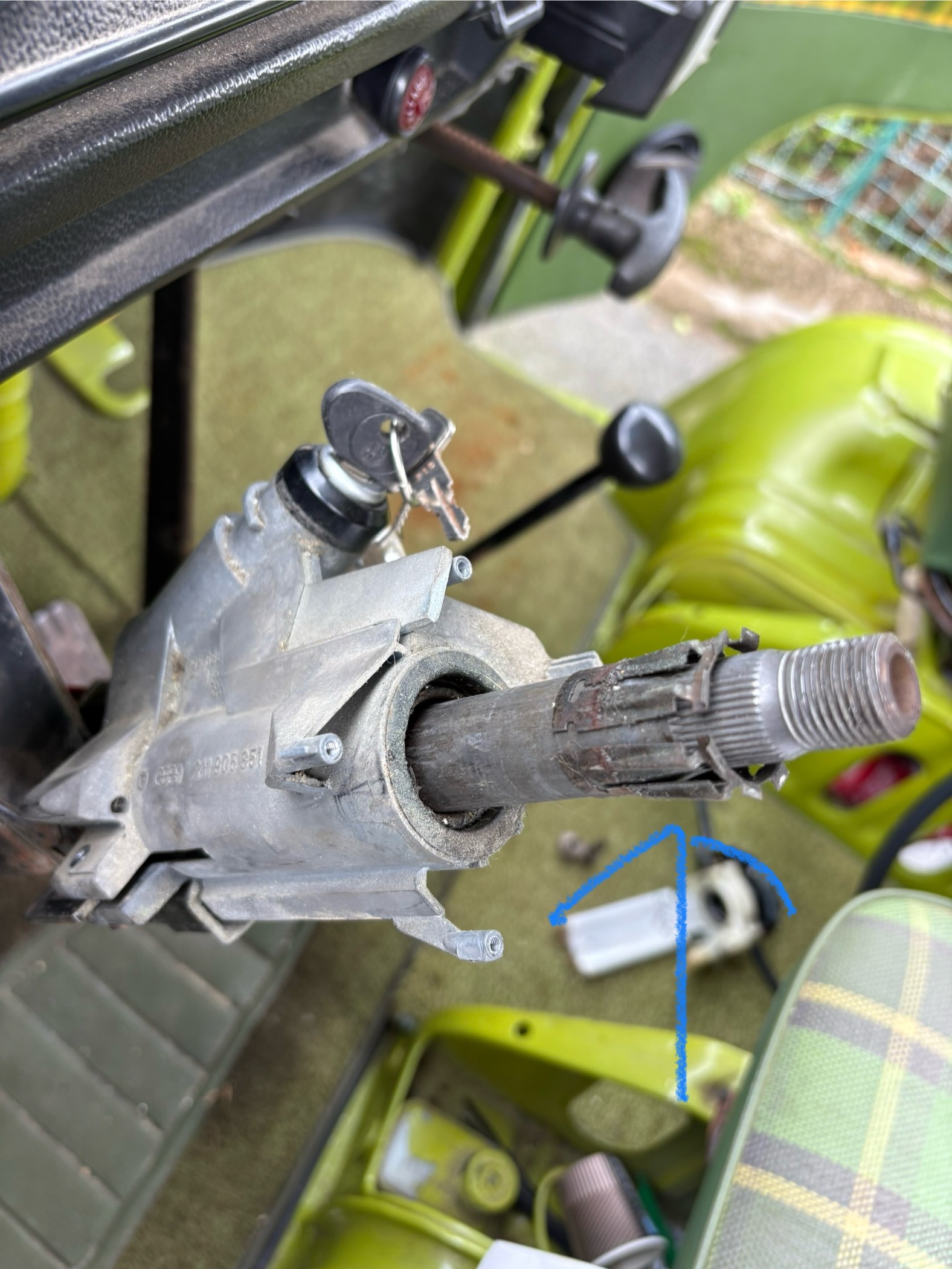 Dans la bataille j’ai perdu cette pièce (une bague) au bout de la flèche bleue: une forme entretoise qui fait le tour de l’axe qui cale le volant / elle sert de sur épaisseur entre les deux tubes