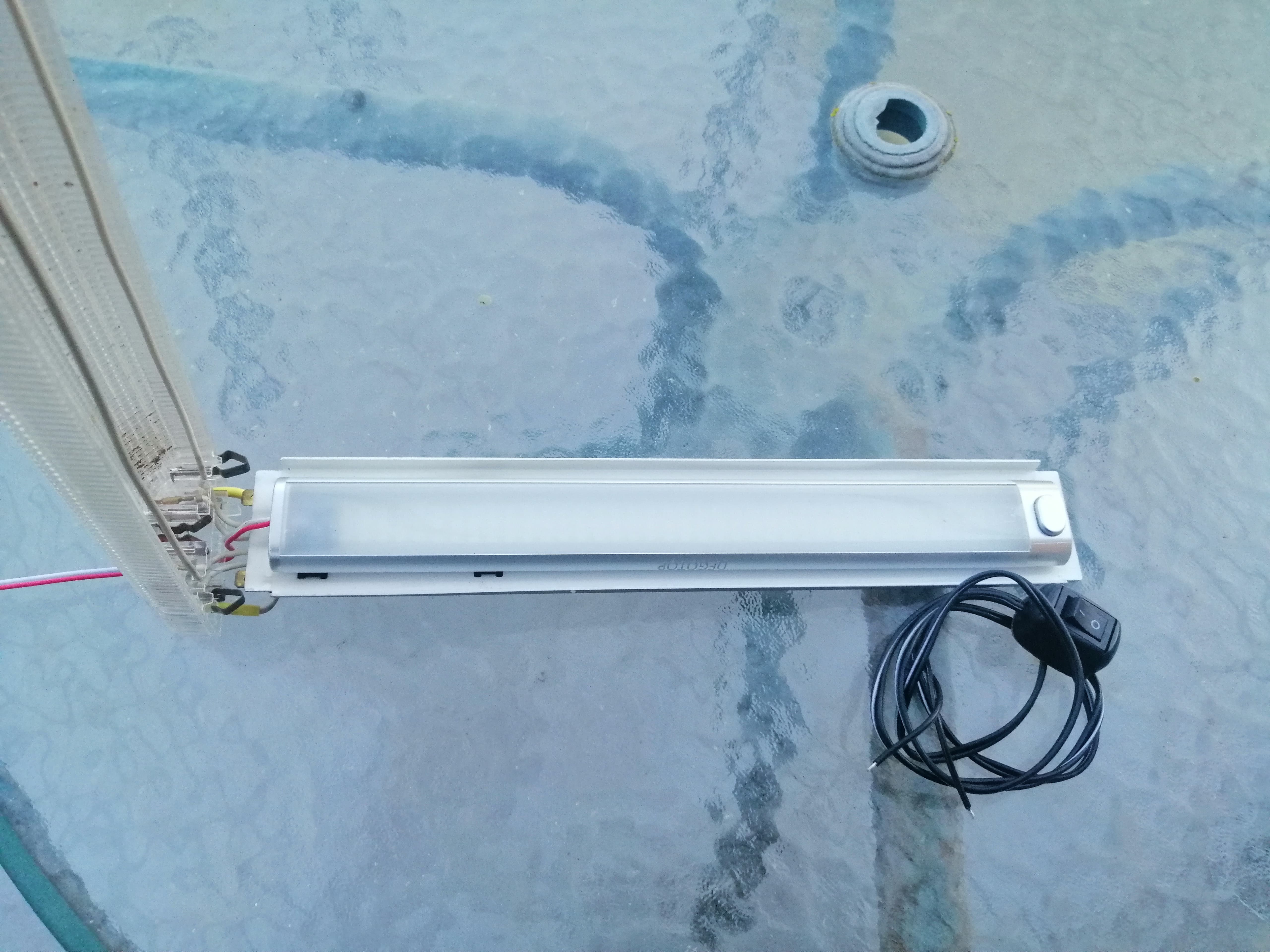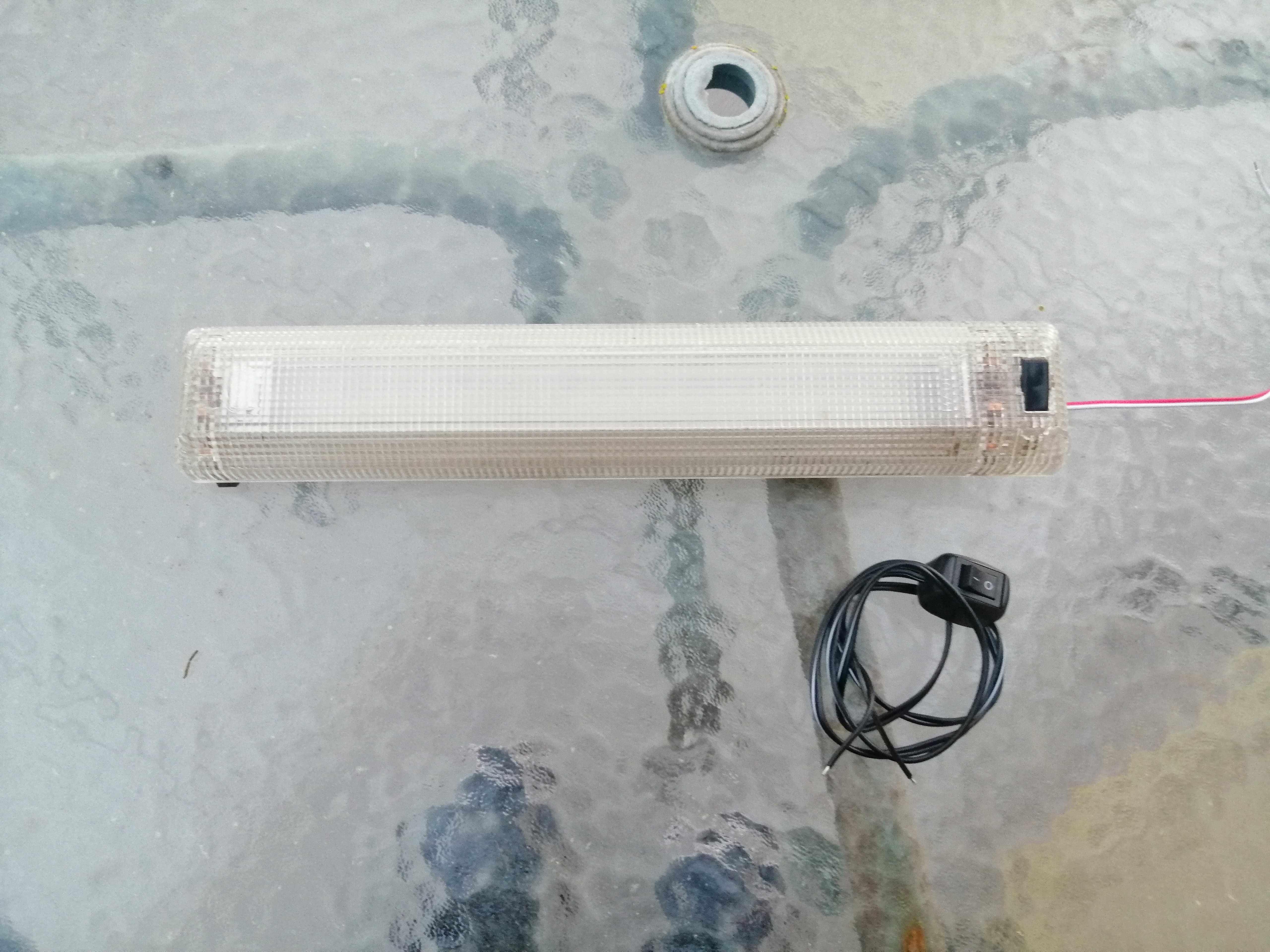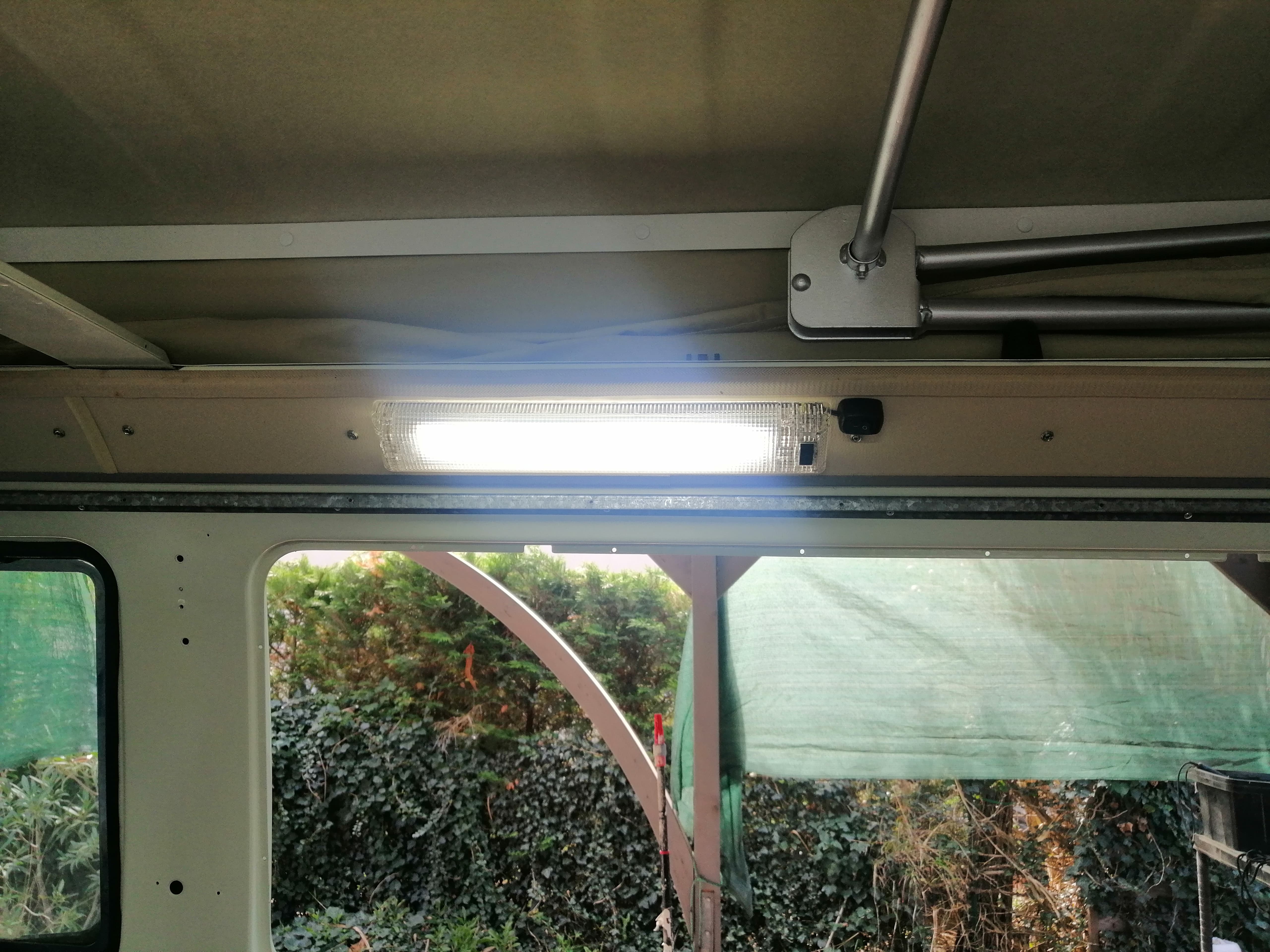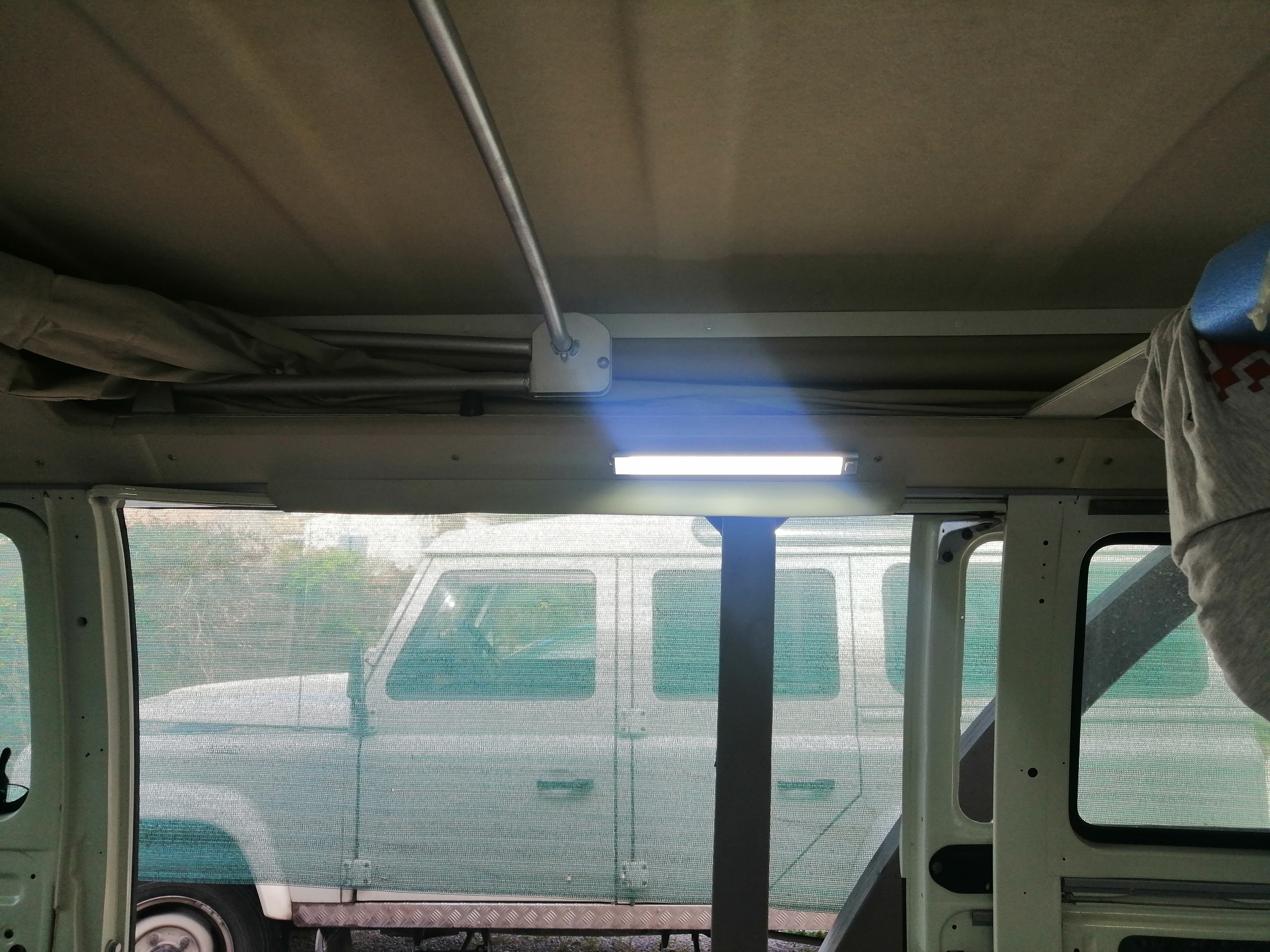 J’ai aussi « upgrade » la réglette Westfalia. Même si je pouvais changer l’interrupteur, j’avais pas confiance dans le circuit imprimé. Alors j’ai acheté une réglette led et un interrupteur. La réglette se place dans l’espace du tube neon, après je rajoute une interrupteur avec un circuit nouveau.