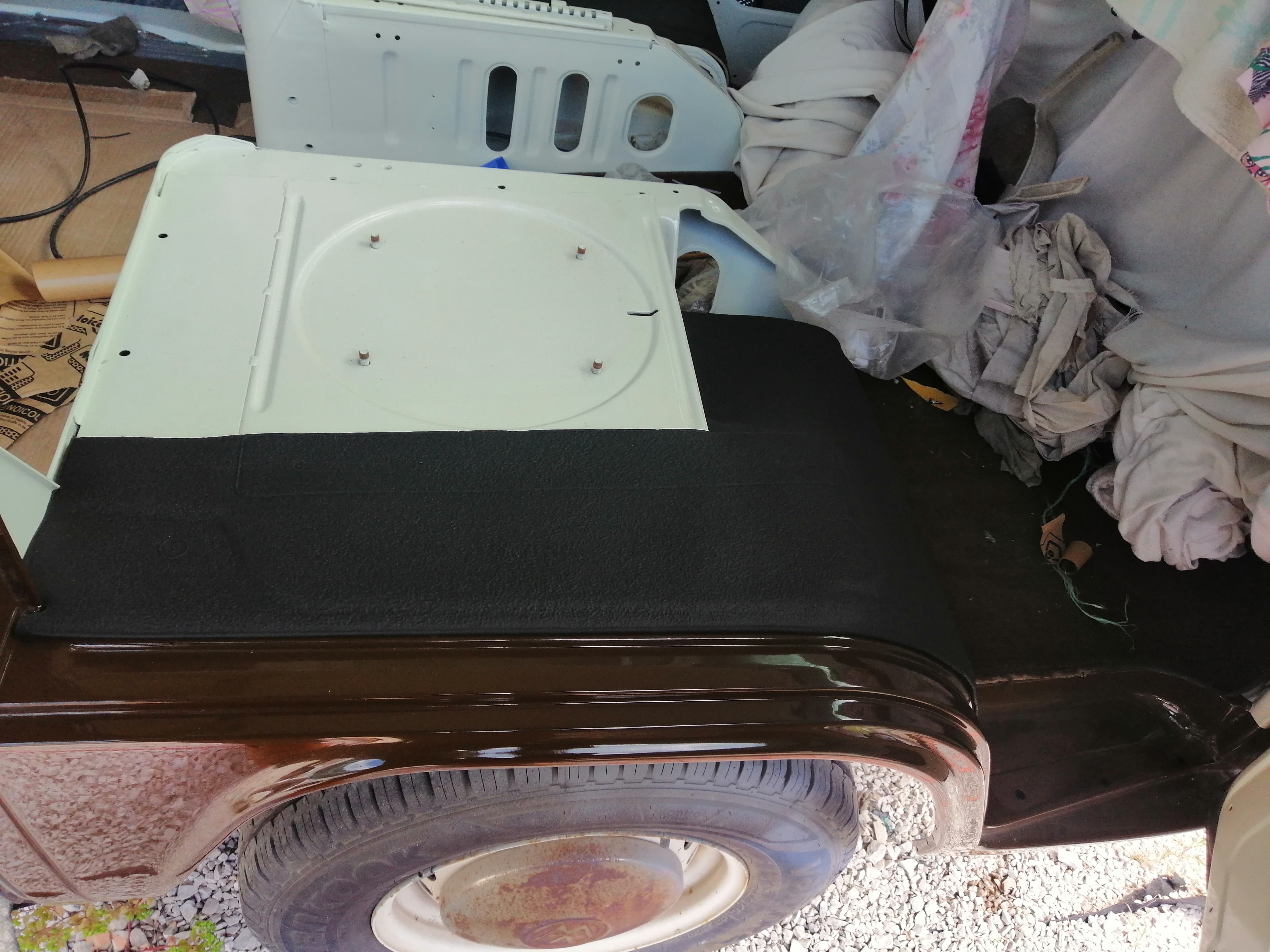 Pour le ciel de toit de la cabine, j’ai eu des difficultés. Au début j’ai acheter chez bus.ko la toile en reproduction westfalia… J’ai reçu une vieille toile déformée mais je l’ai acheter il y a plus d’un an pour étaler le budget…donc dur pour les réclamations