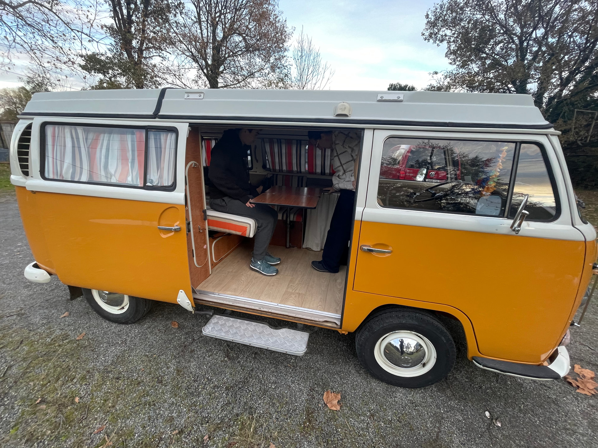 le voila! un combi T2a de 1970, à l’origine transport pour les ouvriers d’une entreprise, transformé en 1974 Westfalia… récupéré aujourd’hui!! hyper happy!!!