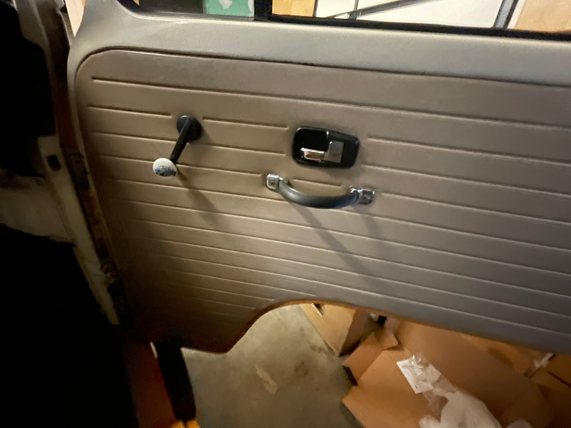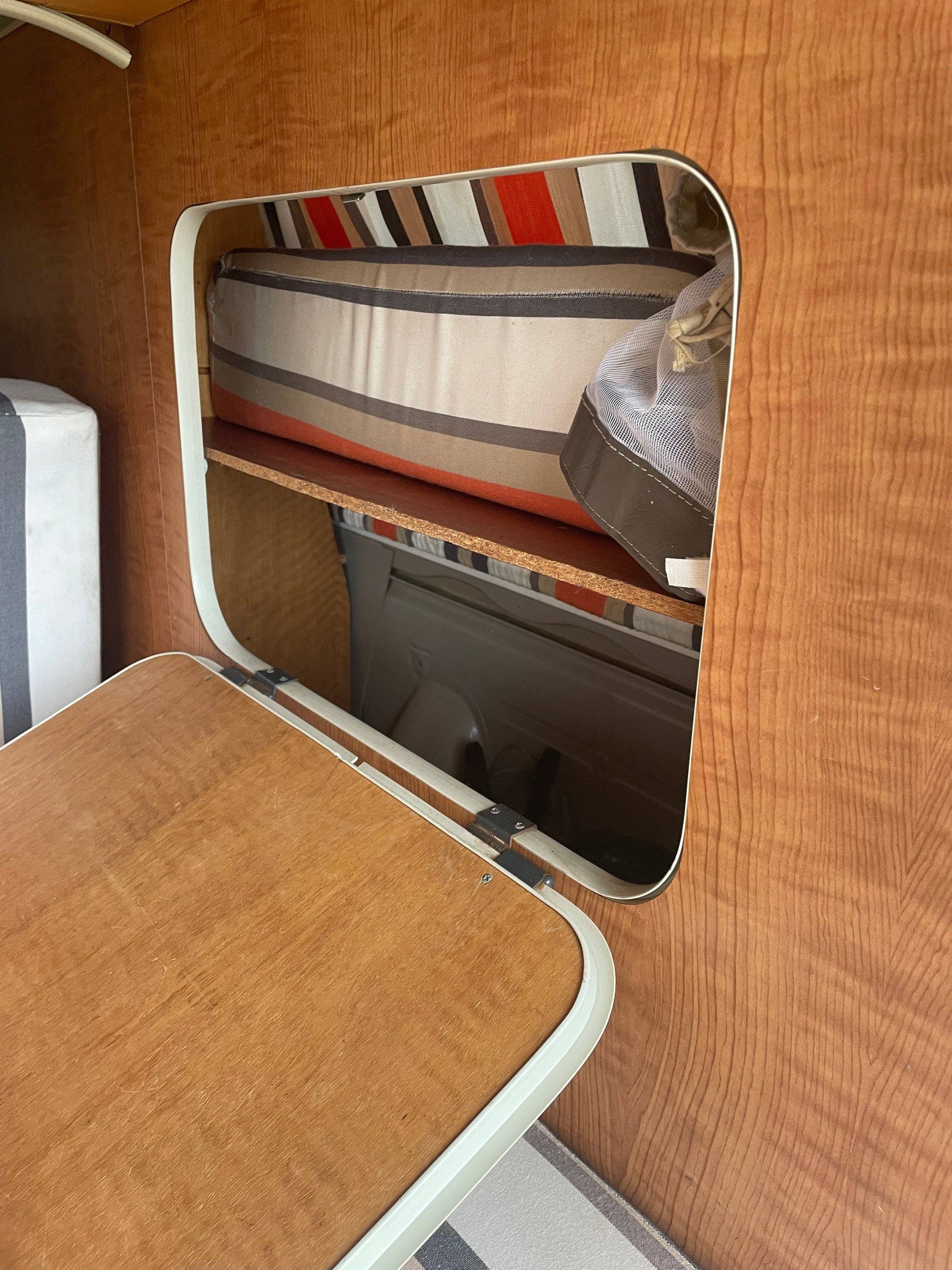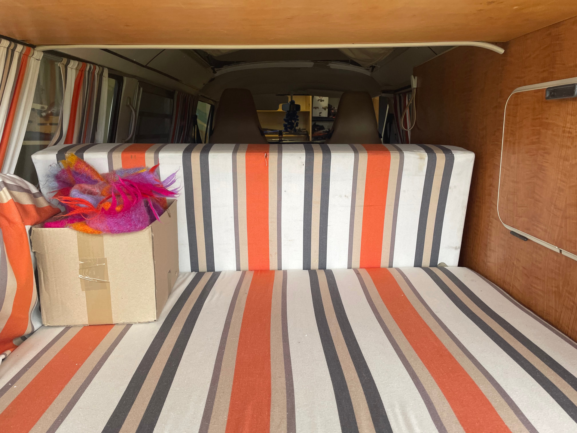 Bi-ton Yellow Sierra (j’adore cette couleur!) avec un tissu intérieur typé basque, origine du précédent propriétaire… y compris pour les rideaux, et très bien fait! quelques-uns sont un peu fatigués, et probablement seront amenés à évoluer, mais en l’état, ils son encore fonctionnels.