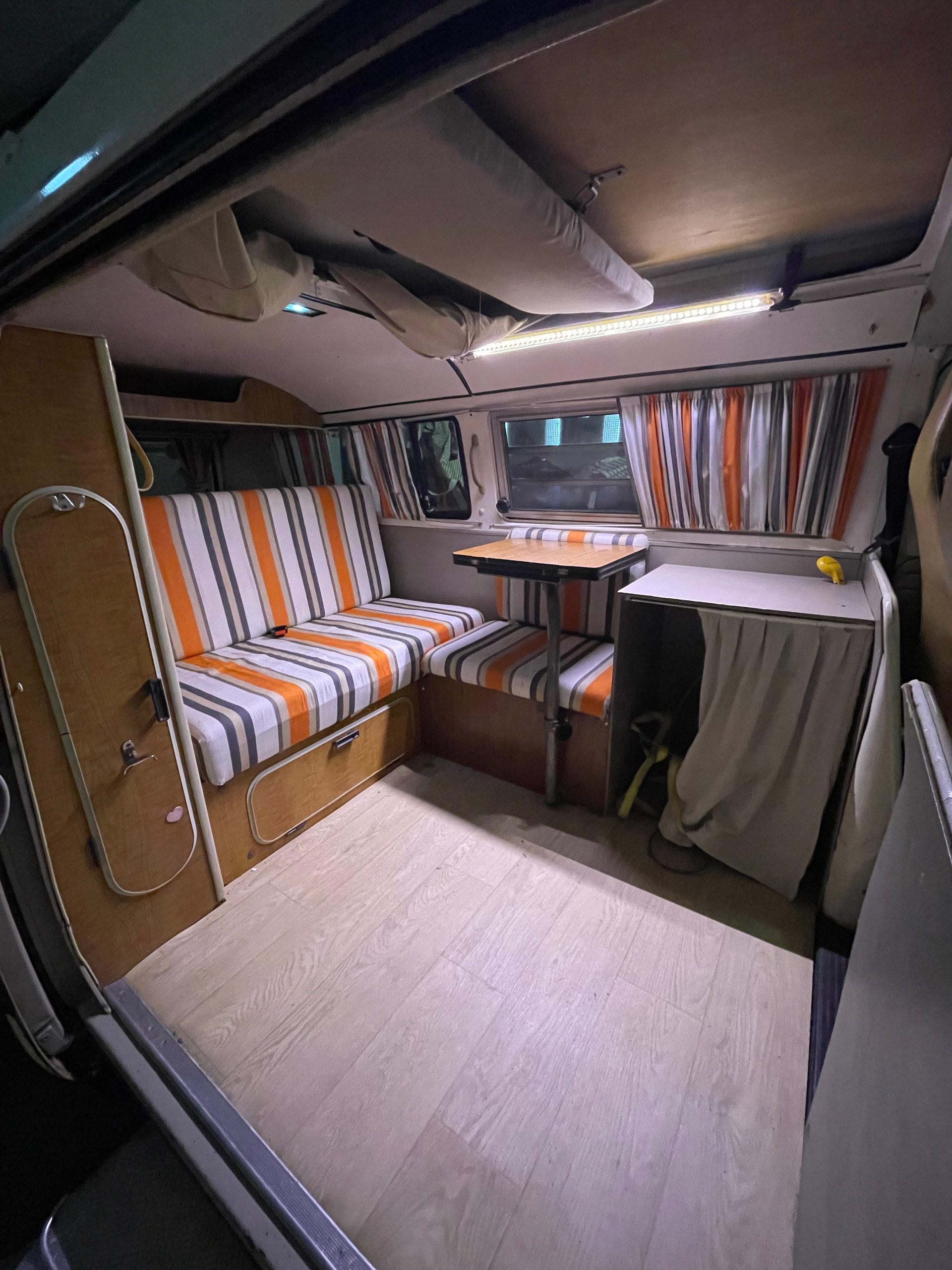 - banquette arrière clic-clac + siège de coté, table pivotante fixée sur le siège de côté, pas de frigo ou élément évier… pas grave pour notre usage, et cela laisse de la place pour le chien (gros gabarit qui a besoin de pouvoir s’étendre!)