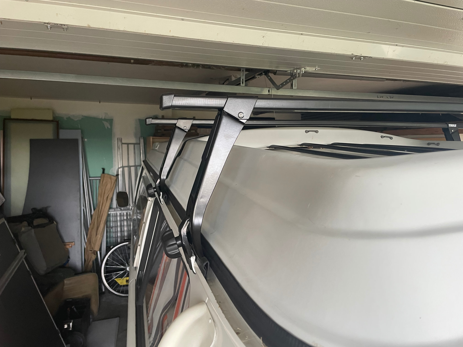 Reste plus qu’à y mettre la tente de toit, pas possible à ce stade dans le garage, ça ne passe pas sous la porte (!!!), il me faut donc des bras pour la déposer sur le toit et tester… bras encore endormis à cette heure post réveillon et 1er de l’an… !!!