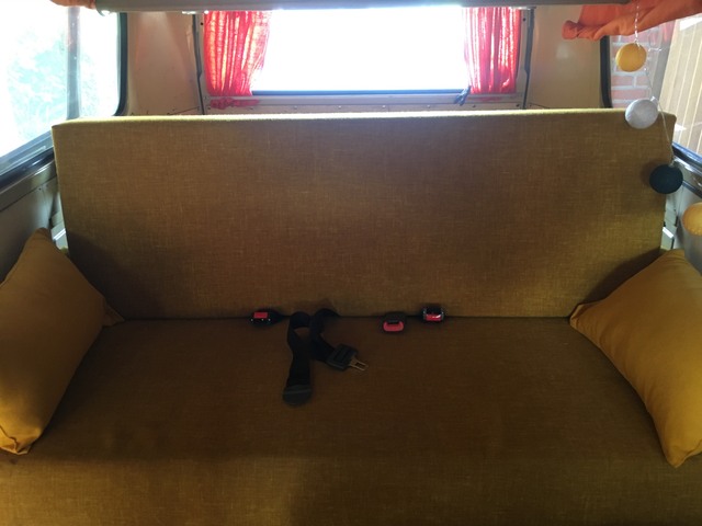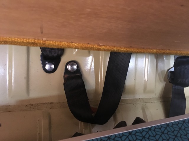 Montage de ceintures 3 points sur la banquette arrière (je n’avais qu’une ceinture pour 3 places, et ventrale uniquement… pas compatible avec le siège bébé !) Alors on déplace la ventrale sur la place du milieu, et on ajoute de chaque côté des 3 points à enrouleur. Ce sont des Securon, achetées sur JustKampers (justkampers.com/fr/211-857- … -bays.html)