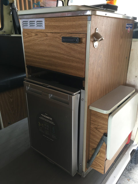 J’ai réussi à sortir le frigo du meuble Westy, en prévision de son remplacement. Une galère, ce meuble a été bricolé, réhaussé, des vis et des pointes ont été rajoutées pour fixer le frigo, tout ça sur un bas de meuble qui a pris l’eau par le passé et dont la base s’effrite facilement. Enfin on s’en sort toujours !