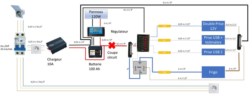 J’aurai donc, dans le « coffre » sous le siège dos à la route, tout l’équipement : arrivée du 220V, disjoncteur différentiel, batterie, régulateur de charge pour le panneau solaire, chargeur 220V, prises diverses.