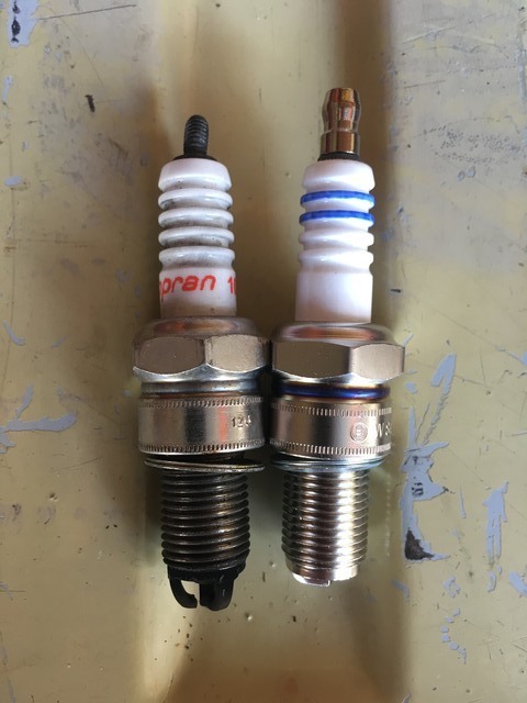 A gauche une ancienne (marque toptran, vous connaissez ? J’ai plusieurs trucs de cette marque sur mon moteur : allumeur, courroire d’alternateur, filtre à air… ça vaut quoi ?) Et à droit une nouvelle, Bosch W7CC. Pas le meilleur choix apparemment, mais je ne l’ai vu qu’après avoir commandé