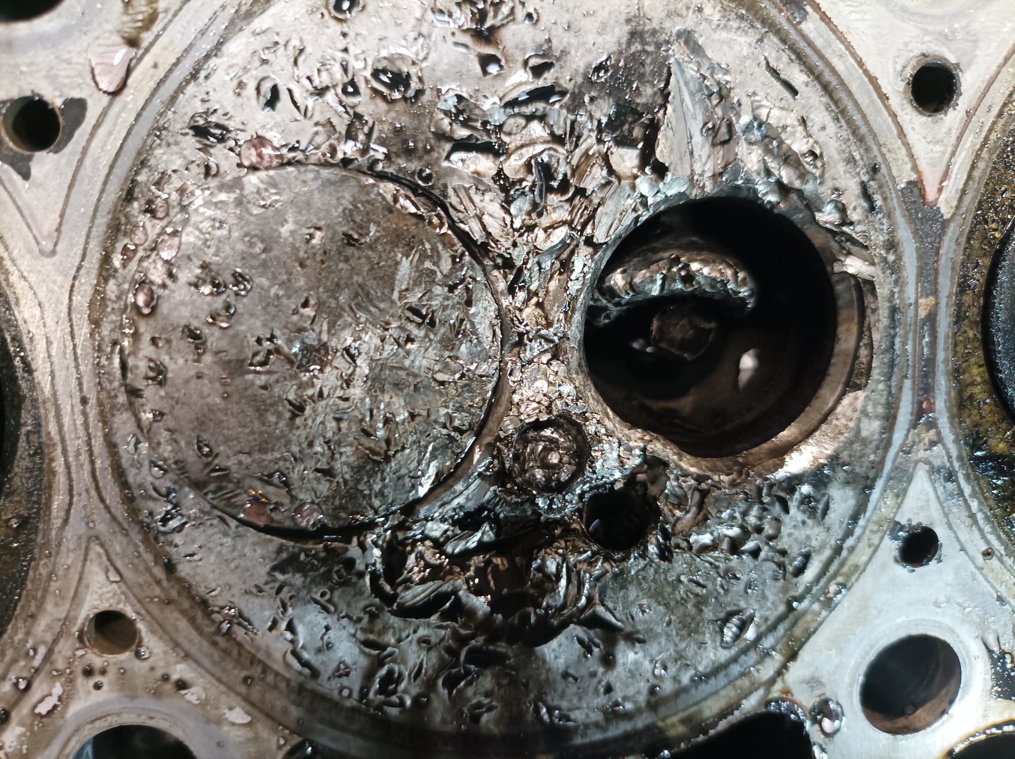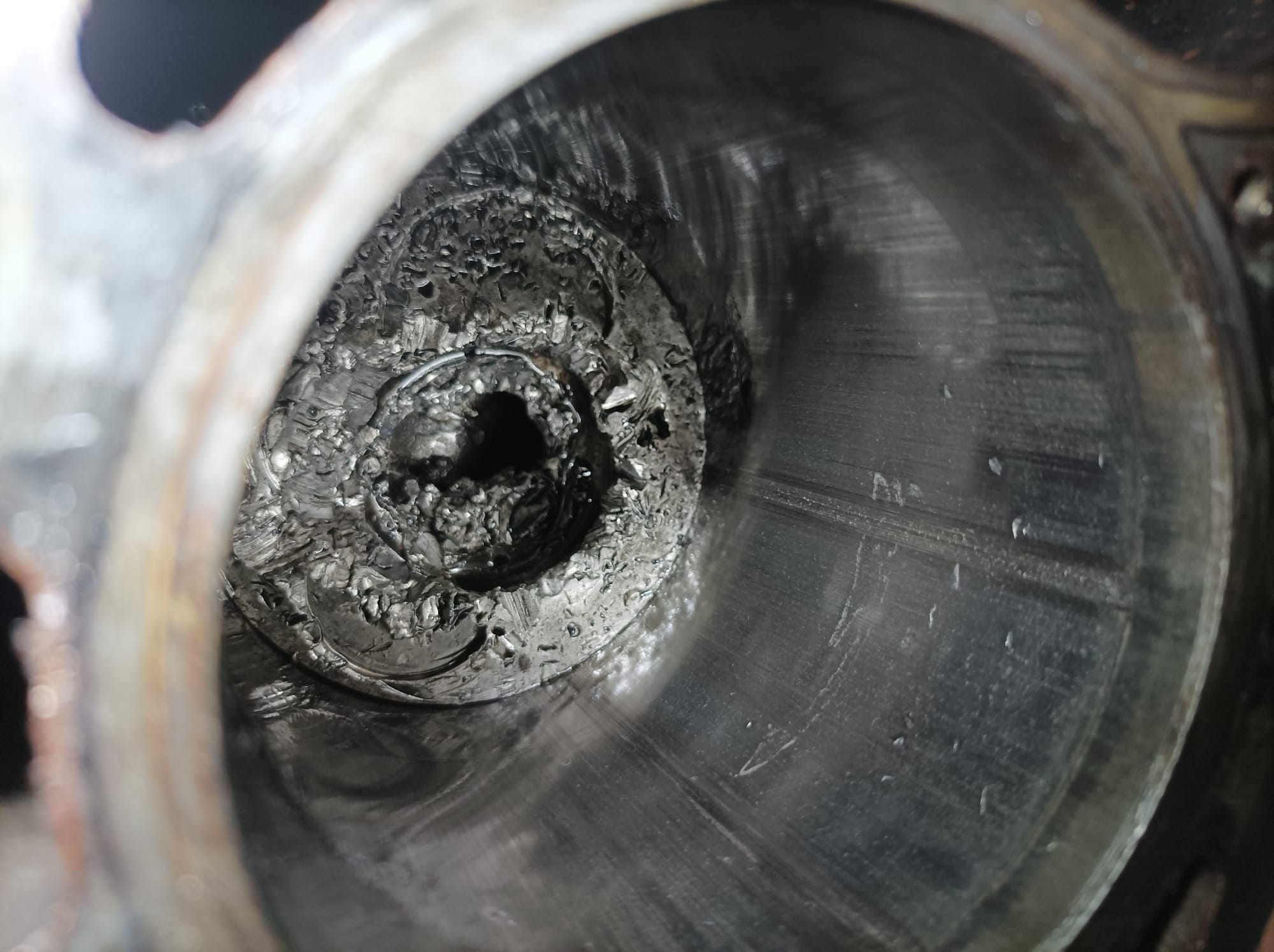 Diagnostic : une soupape qui a cassé et est tombée dans le cylindre… (cylindre perforé ! On voit la tête de bielle a travers le trou)